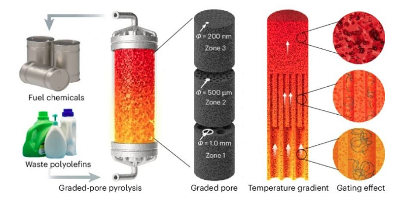 Вместо катализаторов, традиционно применяемых в пиролизе, команда использовала реактор с углеродной колонной, напечатанный на 3D-принтере. Конструкция состоит из трех секций с уменьшающимся размером пор (от миллиметров до нанометров). Такой градиент позволяет поэтапно проводить разложение полимера, предотвращая попадание крупных молекул в последующие зоны без достаточной обработки.
